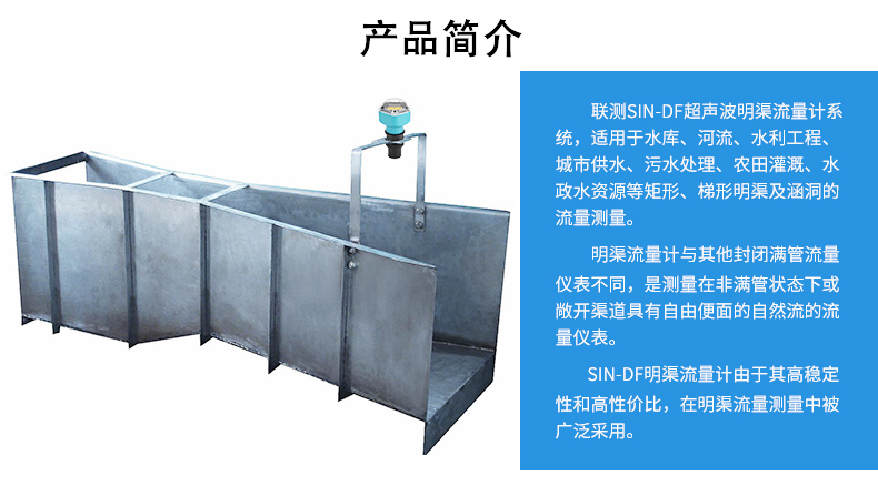 超聲波明渠流量計與量水堰槽配合使用,測量明渠內水的流量。主 要用于測量污水廠、企事業單位的污水排放口、城市下水道的流量及農 田水利中的渠道等。