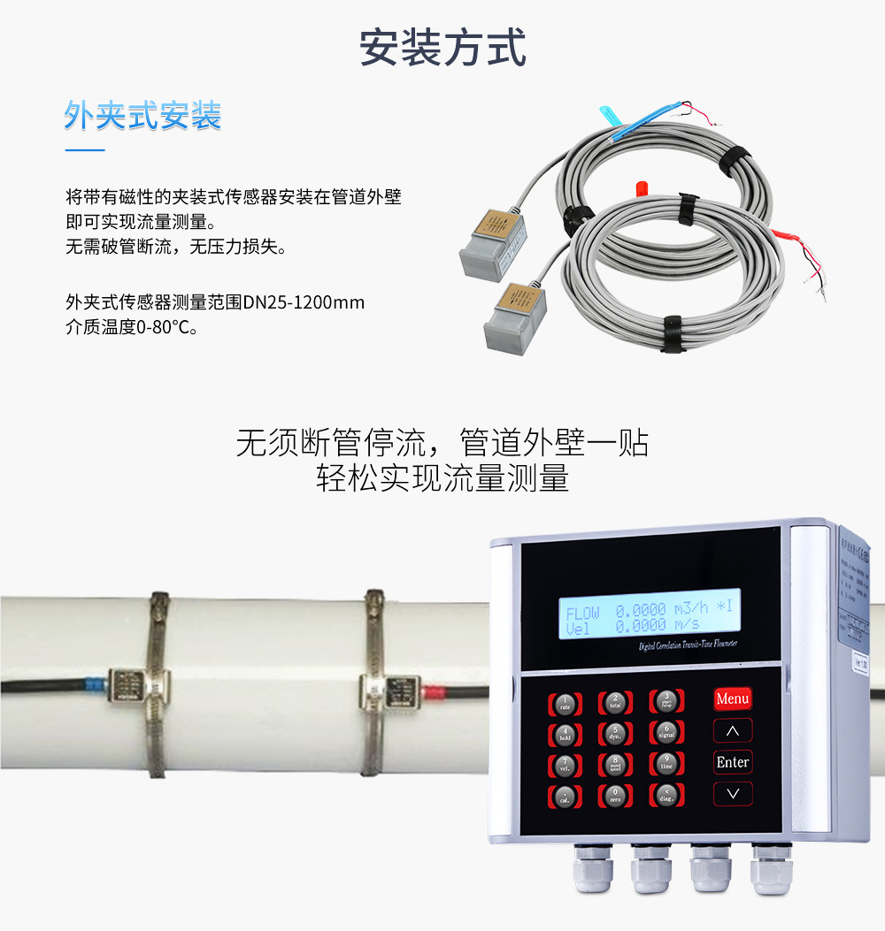 測超聲波流量計適合相對純凈液體流量的管外測量,尤其是在水流量測量、在工業(yè)循環(huán)水、空調(diào)制冷循環(huán)水、原水、高壓水、自來水,污水排放管等廣泛應(yīng)用。