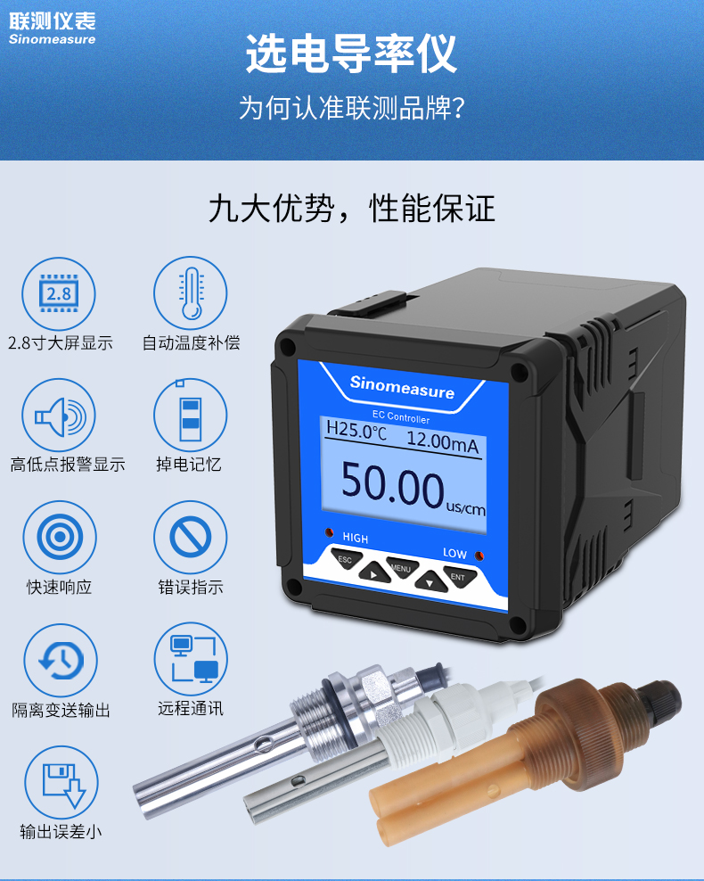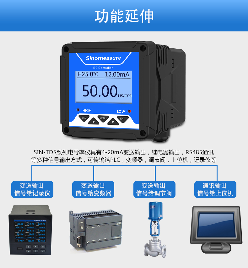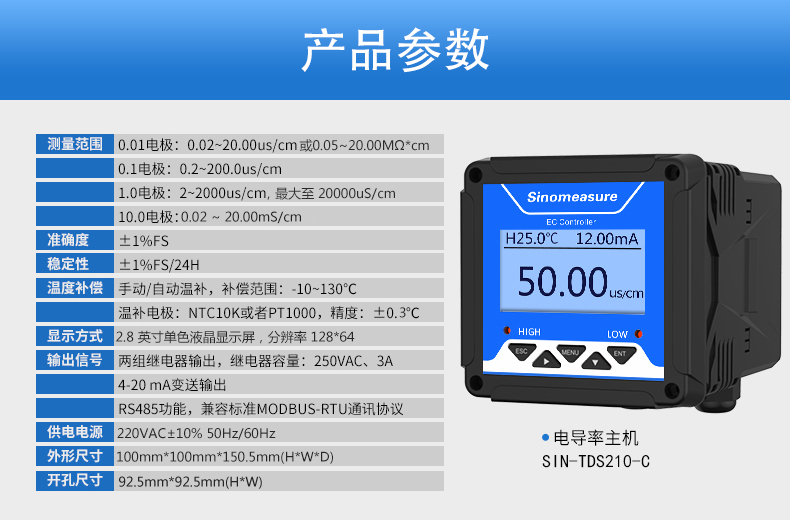 SIN-TDS210-C工業(yè)電導(dǎo)率儀表,廣泛應(yīng)用于火電、化工化肥、冶金、環(huán)保、制藥、生 化、食品和自來水等行業(yè)。控制器主要對(duì)溶液中的電導(dǎo)率/總?cè)芙夤腆w/ 電阻率和溫度進(jìn)行連續(xù)監(jiān)測(cè)。