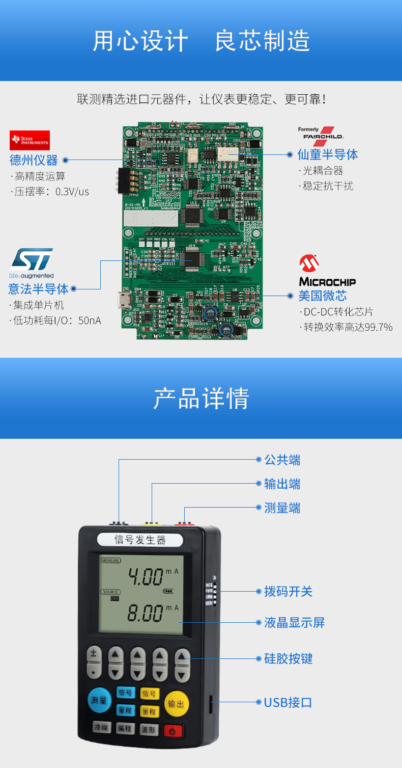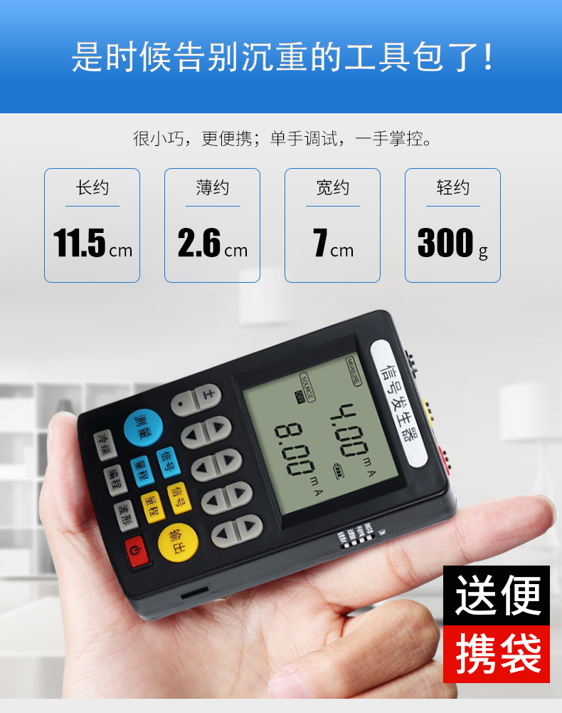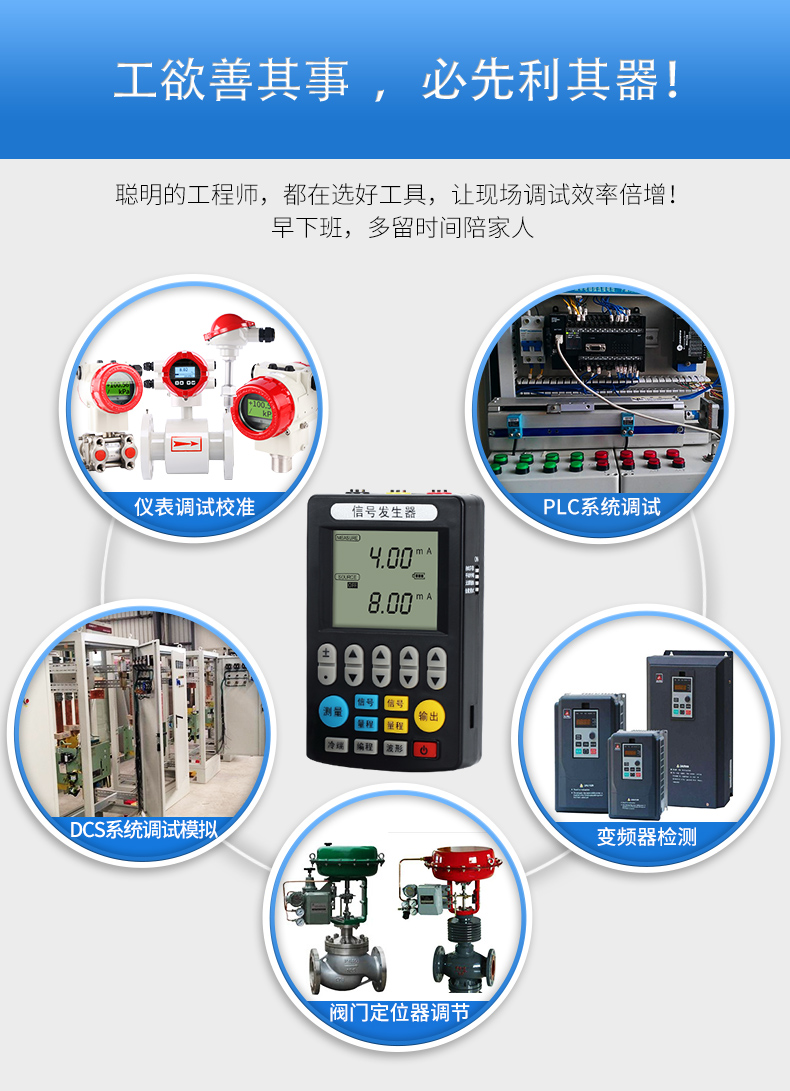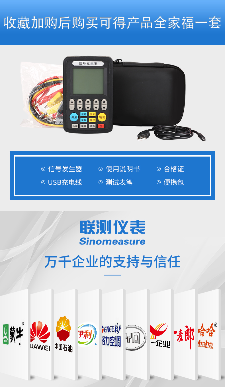 信號發(fā)生器具有多種信號的測量和輸出功能,包括電壓、電流、熱電偶,采用高清LCD液晶屏和功能分明的硅膠按鍵,操作簡單,待機(jī)時間長,精度高,并且具有可編程輸出的功能。