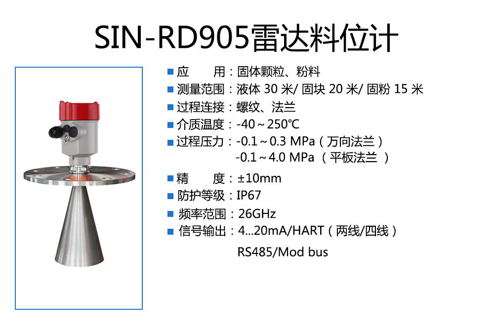 您的位置: 首頁(yè) > 雷達(dá)液位計(jì) >SIN-RD905雷達(dá)料位計(jì)_適用于固體顆粒、粉料_