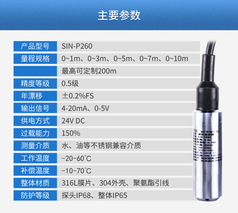 SIN-P260/P2600投入式液位變送器由高性能擴散硅壓阻式壓力傳感器作為測量元件,把與液位深度成正比的液體靜壓力準確測量出來